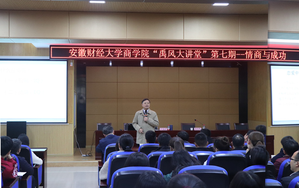 4月11日下午,安徽财经大学商学院第七期“禹风大讲堂”在格物楼B101多功能报告厅举行,省教学名师、安徽财经大学商学院院长刘福成教授为我院师生作题为《情商与成功》的专题讲座。讲座由副院长单学勇主持。