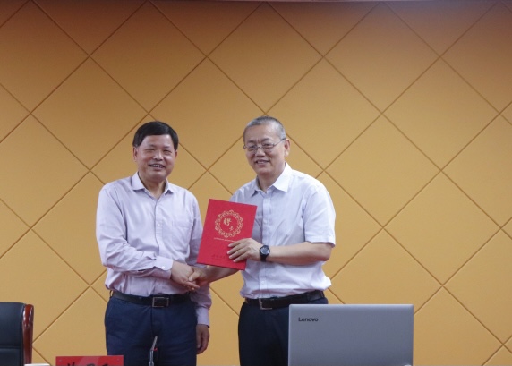 讲座开始前,校长刘福成为苏君阳教授颁发bat365正版唯一官网兼职教授聘书。