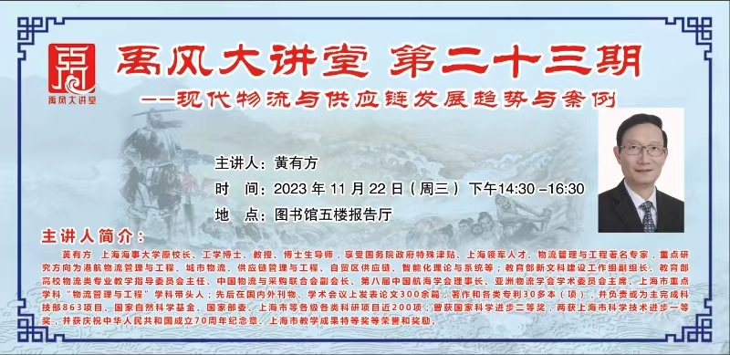 主讲人简介:黄有方 上海海事大学原校长、工学博士、教授、博士生导师,享受国务院政府特殊津贴、上海领军人才、物流管理与工程著名专家,重点研究方向为港航物流管理与工程、城市物流、供应链管理与工程、自贸区供应链、智能化理论与系统等;教育部新文科建设工作组副组长、教育部高校物流类专业教学指导委员会主任、中国物流与采购联合会副会长、第八届中国航海学会理事长、亚洲物流学会学术委员会主席、上海市重点学科“物流管理与工程”学科带头人;先后在国内外刊物、学术会议上发表论文300余篇,著作和各类专利30多本(项),并负责或为主完成科技部863项目、国家自然科学基金、国家部委、上海市等各级各类科研项目近200项;曾获国家科学进步二等奖,两获上海市科学技术进步一等奖,并获庆祝中华人民共和国成立70周年纪念章、上海市教学成果特等奖等荣誉和奖励。