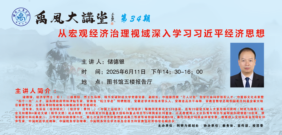 主讲人简介:储德银,经济学博士(后)、二级教授、博士生导师,现为安徽财经大学党委常委、副校长;中组部国家“万人计划”哲学社会科学领军人才、中宣部文化名家暨“四个一批”人才、国务院政府特殊津贴专家、安徽省“皖江学者”特聘教授、安徽省学术和技术带头人、安徽省高水平导师、安徽省教学名师和国家社科基金重大项目首席专家,主要从事财税政策与体制改革等方面研究。