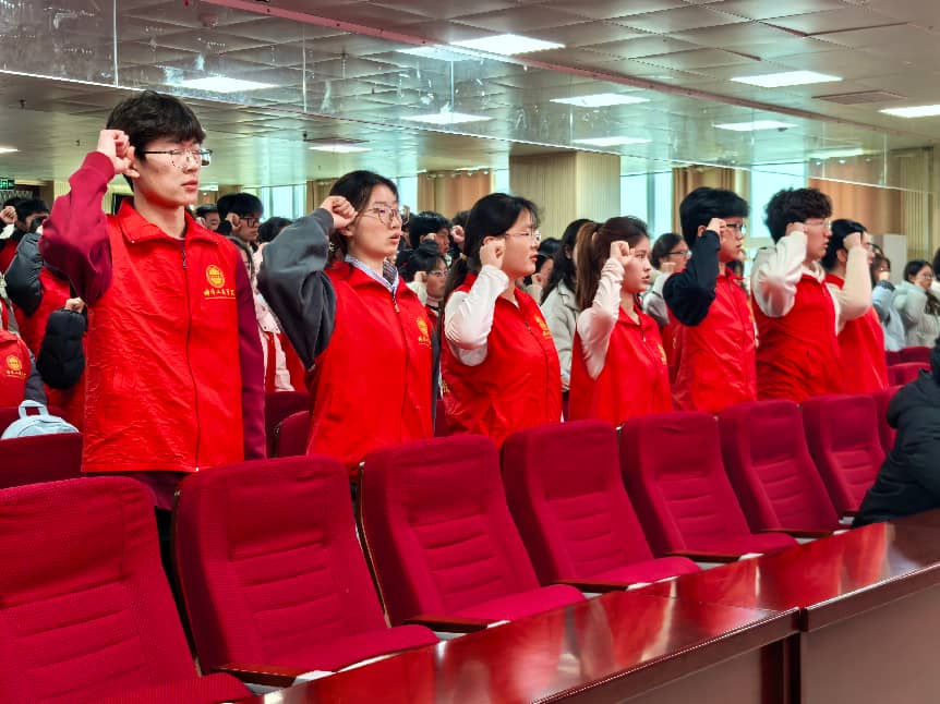 仪式在《中国青年志愿者之歌》的激昂歌声中开启。志愿者代表缪玙洁绘声绘色地分享志愿服务故事,以亲身经历诠释志愿精神,引发在场志愿者共鸣。随后,全体志愿者在校青协理事长赵沁蕊的领誓下庄严宣誓,铿锵誓言彰显青年志愿者的责任与担当。