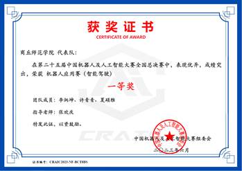 中国机器人及人工智能大赛是一项历史悠久、影响广泛的全国性学科竞赛,迄今为止已举办25届,被誉为机器人界的“奥林匹克”,连续多年入选中国高等教育学会《全国普通高校大学生竞赛排行榜》榜单。本届赛项包括创新、竞技、应用、任务挑战4大类,比赛主要考查机器人及人工智能创新设计与应用、任务挑战、场景化应用等多个层面的知识。赛前,两支晋级全国总决赛队伍在指导老师张欢庆的带领下积极训练,刻苦钻研,不断总结经验,做好了充分准备,在比赛中沉着冷静,灵活应对,最终获得智能驾驶赛项国家级一等奖、城市道路识别赛项国家级二等奖。