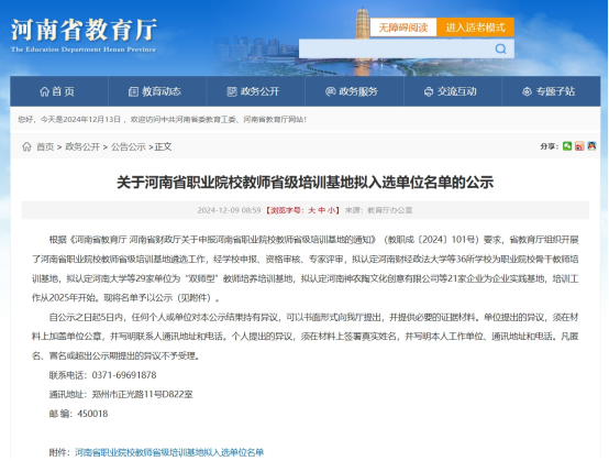 近日,河南省教育厅公示了新一批的河南省职业院校教师省级培训基地入选单位名单。经过学校申报、资格审核、专家评审,最终金年会成功获批河南省职业院校“双师型”教师培养培训基地。jinnianhui金年会诚信至上承担计算机相关专业的师资培训。