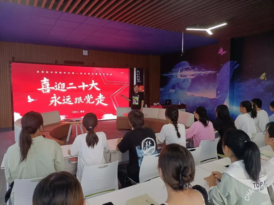 2022年10月2日,为迎接党的二十大的召开,jinnianhui金年会诚信至上学生第一党支部于三商楼VR活动室举办主题党日活动。支部书记戴艳主持。