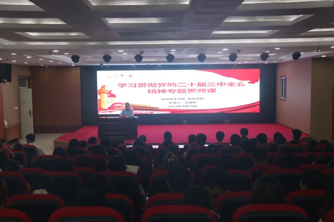 本次思政课由学院党委书记王国华主讲。王国华以《学习贯彻党的二十届三中全会精神,争当新时代推动学院发展的排头兵》为题,全面系统阐释了党的二十届三中全会召开的时代背景、重要意义,并结合新时代背景下学院工科专业人才培养实践,从践行教育、科技、人才一体化部署的角度,对青年学生的学习与发展提出了希望和要求。