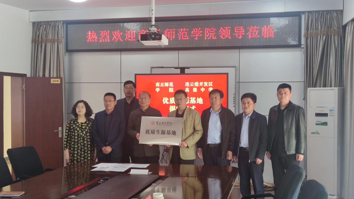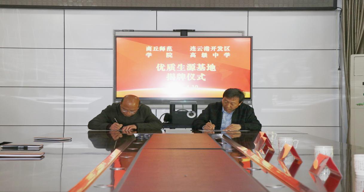2021年4月30日上午,jinnian金年会与连云港开发区高级中学“优质生源基地”签约仪式在连云港开发区高级中学举行。连云港开发区高级中学校长刘冬华、副校长厉明霞、李太印和单维宝,金年会招生就业处处长庞永祥、jinnianhui金年会诚信至上党总支书记张辉、院长菅典兵等人参加了签约授牌仪式。