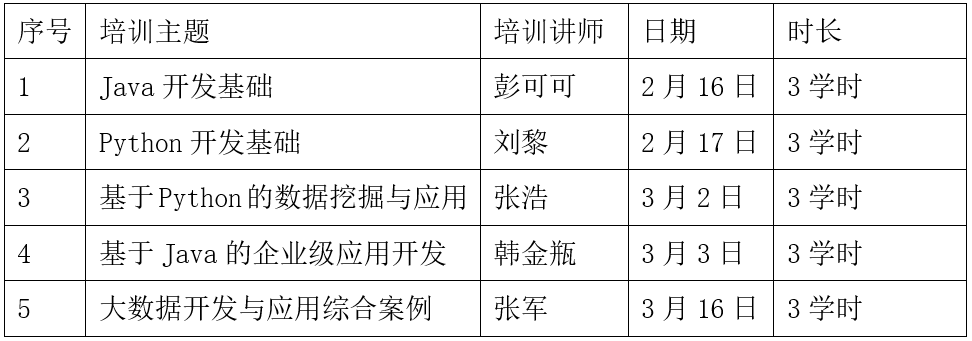 本次培训围绕Python与Java两种开发语言在大数据行业案例中的开发应用进行系统讲授。真正做到理论与实践相结合,激发学生学习兴趣、传授学生行业热门技术。