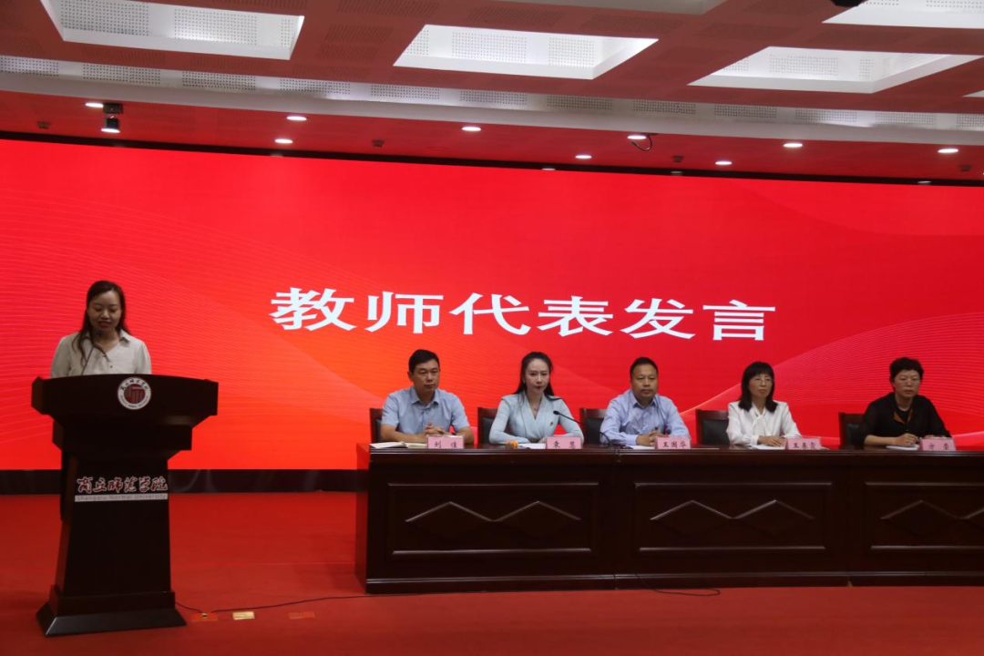 教师代表朱琳老师,她希望大家能够多参加社团活动、创新比赛和各种体育活动,度过一个丰富多彩的大学生活,同时她也提到每个人最大的对手就是自己,大家要不断超越自己,做到高效自律,要不停的奋斗去为自己拼搏美好的明天。