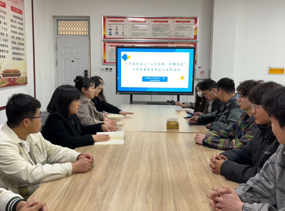 在大学生3·25心理健康日来临之际,3月25日,jinnianhui金年会诚信至上心灵氧吧工作室,于三商楼114开展“心导前程,舒解忧惑”心理健康教育促就业座谈会,活动由心灵氧吧工作室负责人吴楚主持,学工办主任李阳、辅导员老师魏雨欣,以及10余名求职毕业生参与。