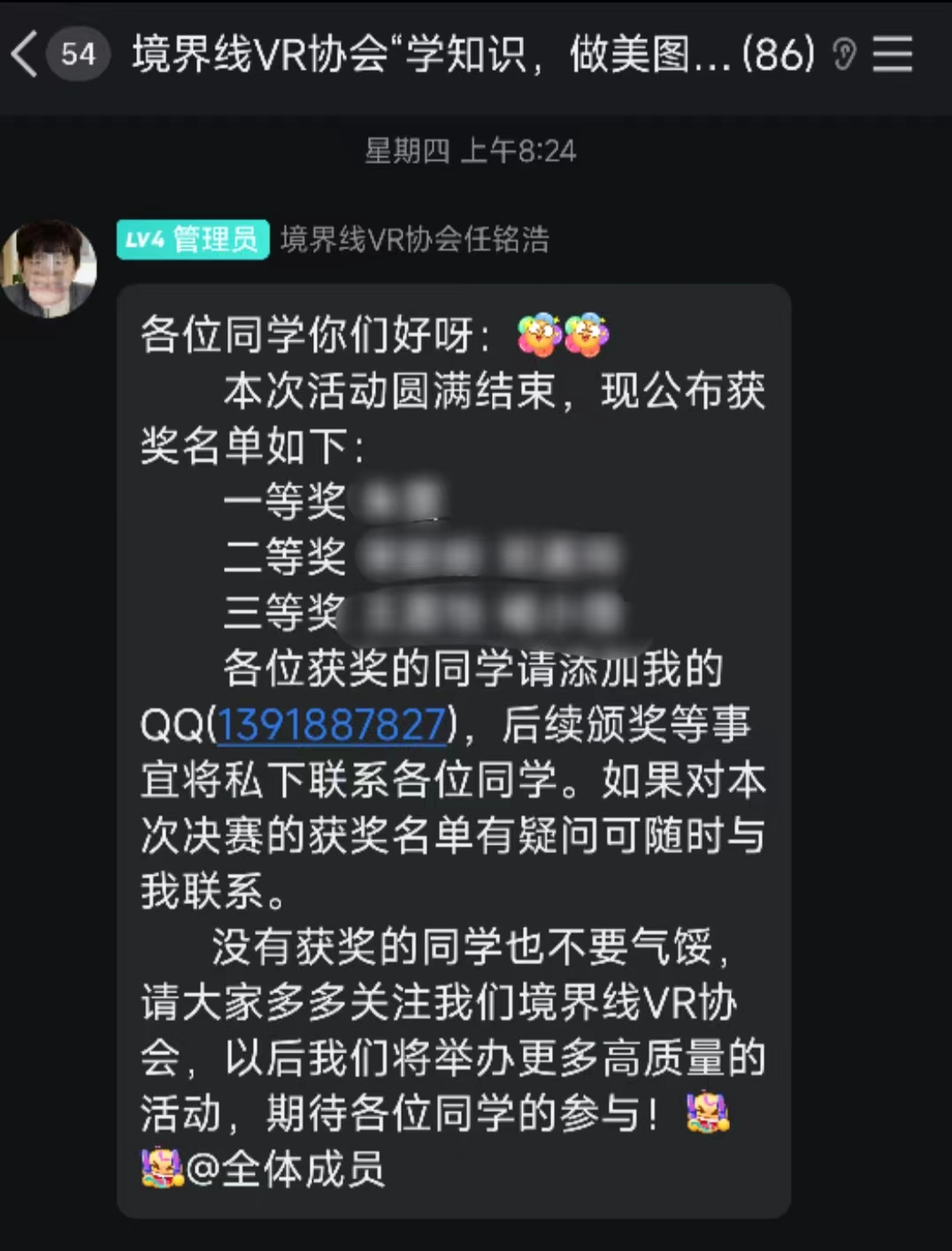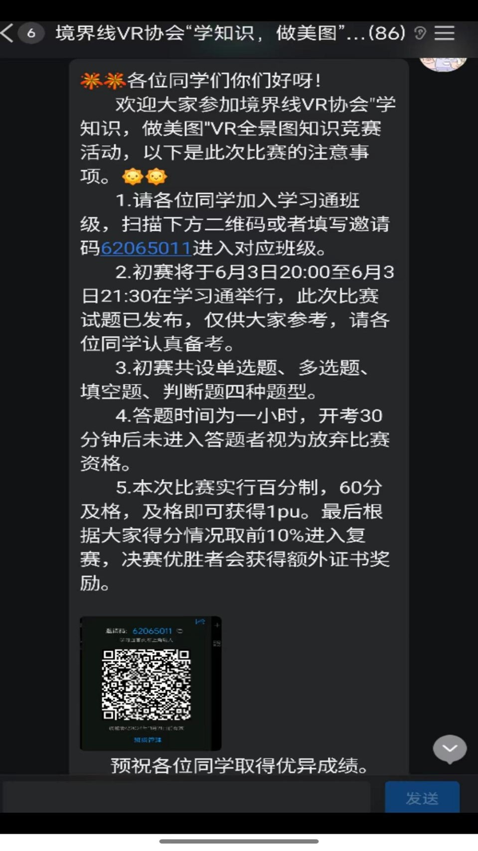 6月3日晚上20时至6月6日下午17时境界线VR协会在QQ群(857456023)和学习通班级(62065011)内举办的为期三天的“学知识,做美图”VR全景图竞赛活动,吸引了全校119名同学积极参与学习通端知识竞赛,收到全校不同学院共17份VR全景图作品参与决赛,经过激烈的竞争,终于落下帷幕。