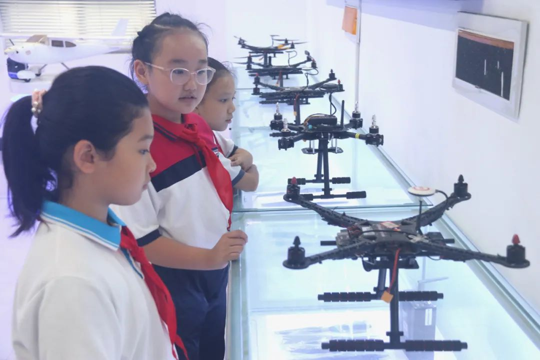在科普老师的带领下,学生们参观了科技感拉满的无人机展厅,各种类型的无人机和挂载设备让孩子们大开眼界。